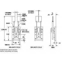 Chopping frequency ranges from 10 Hz to 6 KHz, apertures up to 15 mm are practical in the lower frequencies (under 100 Hz), 0.5 mm at 3 KHz and 0.2 mm at 6 KHz. If the beam size is limitting the chopper rate, consider focusing at the chopper to reduce the beam size. The amplitude oft he motion of the chopper is inversely proportional to ist frequency. You will find examples of the frequency amplitude relationship in the table below. Dark or bright vanes are standard; mirrors, lenses or gratings optional.